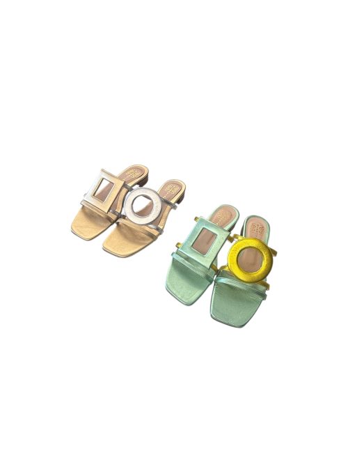 Ecco il Flat più innovativo e grintoso della stagione!Con applicazione geometrica circolare sul piede sinistro e quadrato sul piede destro.Si indossano esattamente così come le vedete!Disponibili in nappa laminata verde&giallo e laminato platino&argento.Una vera chicca!
