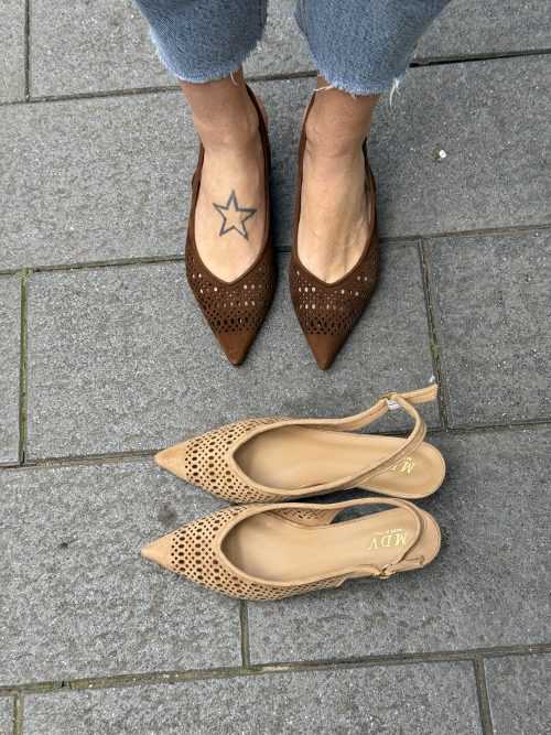 Slingback della linea MdV realizzata in morbidissimo camoscio traforato. Punta affusolata,cuscinetto memory interno e cinturino regolabile.Tasso sottile altezza 6cm.Disponibile camoscio Camel e camoscio cioccolato, i colori più belli della stagione!!!!