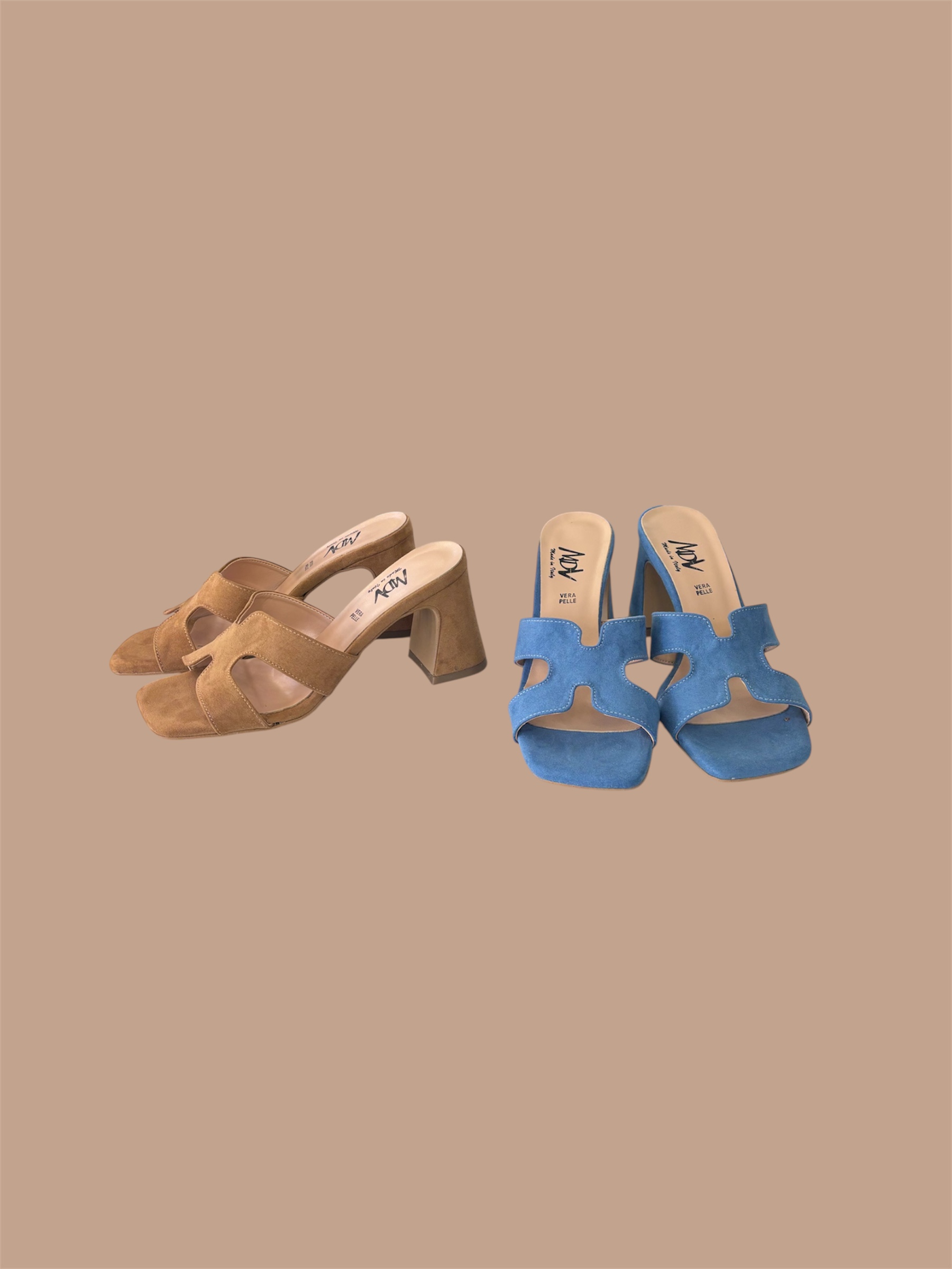 Sabot punta quadra con H, tacco largo a trapezio altezza 9cm.Comodo cuscinetto interno, disponibile camoscio cuoio e camoscio avio.